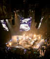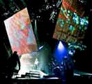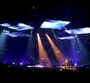 The cantilevered stage set houses an "underworld" of monitors and backline. Above the set hover five translucent video screens with motion control.