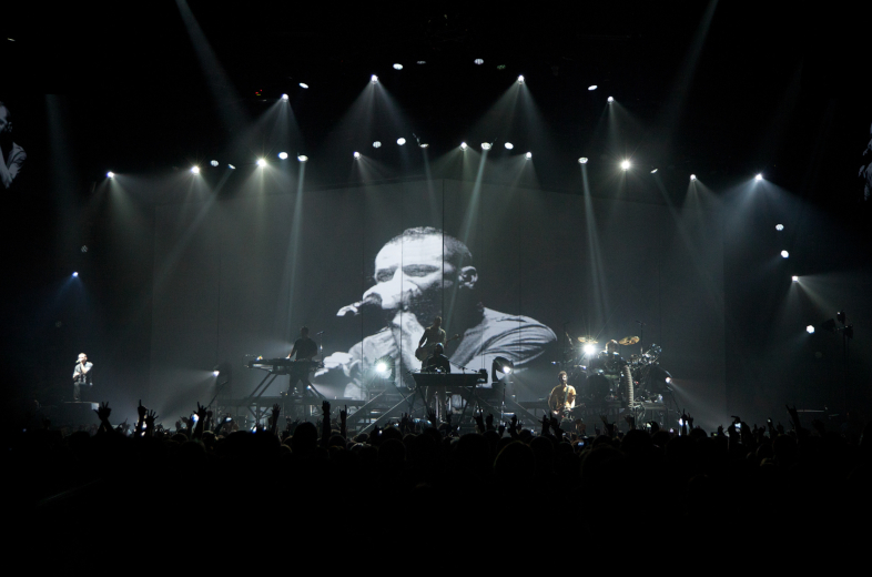 Chevron shaped stage and stage set with articulated vertical louvered panels form